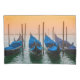 Peaceful setting next to the Doge's Palace in Venice, Italy, with four gondolas, all together pointing to a beautiful misty sunset.