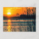 This scenic photo depicts the sun setting over a lake with picturesque reeds in the foreground.