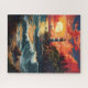 This puzzle features a vibrant illustration of a red and white lighthouse sitting on an ocean cliff as the sky burns a bright red with a sunset. White and teal waves crash towards a rocky brown shore.