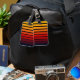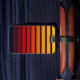 Multicolor striped design inspired by a sunset. Minimalist design in dark blue, and different shades of pink, red, orange, and yellow.