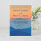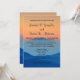A scenic mountain wedding invitation. An abstract creation of a foggy mountain sunset landscape creating a dreamy afterglow effect. The hills and valleys are a deep blue colour with a large hazy looking central mountain in the background. The sky is filled with a misty orange cloudy atmosphere. The processing done to this early evening photo gives it an artistic, painted dreamy feel.