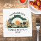 Create unique family reunion napkins for your outdoorsy theme party. The design features a vintage sunset landscape with mountains and pine tree forest and a lake. Type your family name and year via the template text to personalise napkins.
