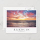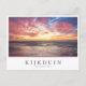 Photo postcard of a colourful sunset with great clouds over the North Sea and the beach of Kijkduin on a summer evening in The Hague at the west coast of the Netherlands with a white edge and in a white box the text 'Kijkduin, Netherlands'. The box has lines in red, white and blue, the colours of the dutch flag.