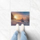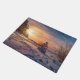 Panoramic view of sunset over winter landscape with covered in snow pine and fir trees against dramatic evening light. Snowy Baltic sea coast.