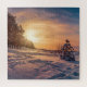 Panoramic view of sunset over winter landscape with covered in snow pine and fir trees against dramatic evening light. Snowy Baltic sea coast.