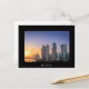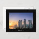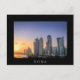 Postcard of a colourful sunset over the skyline with the skyscrapers on the Corniche in the city centre of Doha, capital of the Gulf country Qatar with a white border and the text: 'Doha'.