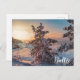 Snowy landscape at sunset, frozen and covered in snow trees in winter.
