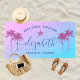 Personalised beach towel design for a girls' beach vacation getaway features a custom first name in modern script writing accented with a starfish and framed by tropical palm trees. Personalise with a name and custom text for the special occasion. Background includes a pretty sunset gradient in violet, purple, and blue colours.