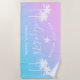 Personalised beach towel design for a girls' beach vacation getaway features a custom first name in modern script writing accented with a starfish and framed by tropical palm trees. Personalise with a name and custom text for the special occasion. Background includes a pretty sunset gradient in bright pink, violet purple, and blue colours.