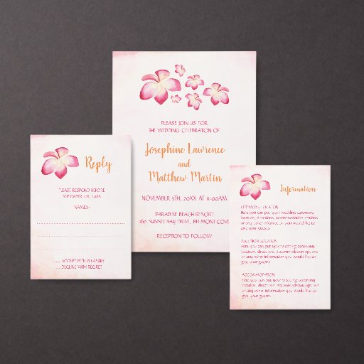 These wedding menu cards feature watercolor pink plumeria flowers. You can change the text sizes and colours by clicking the "Customise" button. These wedding menus are part of the Sunset Plumeria Wedding Collection which includes a full range of matching wedding stationery such as wedding invitations, reply cards, information cards, address labels, stickers, postage stamps, envelopes, favour boxes, wishing well cards, programs, bridal gifts and much more. Visit the collection page in our store to see the full range of products that you can personalise for your wedding day.