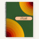 This spiral notebook features a bold and eye-catching colour block design that blends retro and modern aesthetics. The background is a deep forest green, setting a rich and earthy tone. Two large, vibrant concentric semi-circles — one in the top right and the other in the bottom left — add visual interest and warmth. These arcs transition through shades of golden yellow, burnt orange, and deep red, creating a dynamic gradient reminiscent of a vintage sunset.