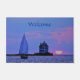 Welcome folks into safe harbour, when one is sailing by for a visit. Scenic sunset sailboat and lighthouse featured on sturdy welcome door mat.