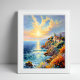 Immerse yourself in the tranquil beauty of "Sunset Serenity by the Mediterranean," a breathtaking AI-generated Impressionism coastal landscape artwork poster capturing the golden hues of a sunset over a picturesque coastal village. The scene is a harmonious blend of vibrant colours and soft brushstrokes, depicting the sun's warm glow as it reflects off the calm waters, with waves gently kissing the rocky shore. Cypress trees stand tall beside charming Mediterranean villas, creating a serene and inviting atmosphere. This artwork is perfect for those who appreciate the serenity of nature and the charm of coastal landscapes. Ideal for enhancing the ambiance of living rooms, bedrooms, or offices, this piece evokes a sense of peace and relaxation. This unique work of art was produced by AI, combining advanced technology with a deep appreciation for natural beauty, resulting in a stunning visual experience.
