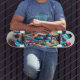 This vibrant skateboard design from "The Cool Cat Collection" features a cool cat skater in the midst of a thrilling ride as the sun sets. The character's dynamic posture and expressive joy capture the exhilarating essence of skateboarding. The background, with its gradient of sunset colours and silhouetted palm trees, creates a lively atmosphere that epitomises the skateboarding spirit in a tropical setting.