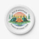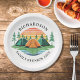 Create personalised paper plates for a family reunion party organised in a camping theme. The design features a vintage sunset illustration with tents in a pine tree forest near a lake on a white background. The template makes it easy to customise the text with your last name and year.