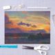 An art design of a beautiful sunset also showing rocks, beach and a man fishing.