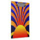 Sun Graffiti brick wall is a digital work of art with a dark blue gradient background and yellow redish orange gradient sun at the bottom, sun beams beaming up and outward.