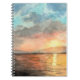 This notebook features a watercolor painting of the sun setting over water with mountains in the background! The clouds are aglow with shades of orange, pink and purple.