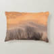 This lovely decorative contemporary accent pillow features an impressionistic abstract design of bare black silhouetted trees and a sunset sky with clouds bathed in orange, salmon, gold, brown, mauve and purple.