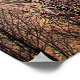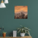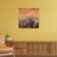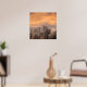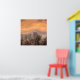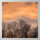This lovely decorative contemporary poster features an impressionistic abstract design of bare black silhouetted trees and a sunset sky with clouds bathed in orange, salmon, gold, brown, mauve and purple.