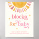 Elevate your baby shower experience with our Sunshine Blocks for Baby Sign! Featuring a boho design with a watercolor sun, retro typography, and star accents, all set against a soft vintage white background. The bright and girly color scheme of pink, peach, and yellow, sets the perfect tone for celebrating your little ray of sunshine on the way.