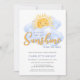 This baby shower invitation is decorated with blue watercolor clouds and a cute yellow smiling sun.