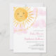 This cute sunshine girl's baby shower invitation features the text "Our little ray of sunshine is almost here!" with a watercolor smiling yellow sun and pink clouds.