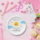 Sunshine theme kid's 1st birthday party paper plate featuring watercolor illustration of a smiling sun with clouds and stars. The text says "XX's first trip around the sun!"