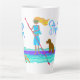 SUP life latte mug with original artwork. A blonde girl paddles on a purple board in tropical water. Her brown dog is riding along and a sea turtle swims alongside. "SUP life" text on one side, and her name on the other in aqua blue with purple drop shadow. Makes a fun gift for a teenage daughter.