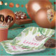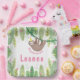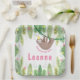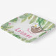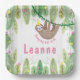 Fun light and dark green jungle leaves decorate these jungle theme | sloth birthday paper plates. Super cute sloth hanging from a bright green vine in the jungle. Fun loving sloth is sporting a yellow and white polka dot party hat! Blue, yellow and pink flowers decorate the jungle leaves. Perfect paper plates for animal, zoo, sloth, or other safari / jungle theme birthday.