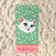 Get ready for some serious summer fun with this totally adorable personalised beach towel! It has the absolute cutest green-eyed kitty cat chilling on it, looking so sweet. The background is a super cool mint green colour, and it's covered in bright and colourful pink, green, and white circles and dots – it's like a party on a towel!