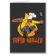 A cartoon of a man dressed as a super hero carrying a plate of steaks and hot dogs and a spatula on a fire background and caption Super Griller available on grilling tshirts, aprons, hats, buttons and more. Make great Father's day or birthday gifts.
