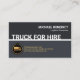 A stylish slogan signage "TRUCK FOR HIRE" sits near the centre demarcating an upper dark grey layer against its lighter counterpart below ; You can edit this caption remarks to suit your own service needs. Below this lies a gold truck logo you can use with the contact details beside it. At the top are your prestigious name and job title.