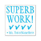 This encouraging rubber stamp design features the encouraging feedback message "SUPERB WORK!" and a customised teacher's name. It also features a decorative check mark. It could be used by a teacher, educator, or tutor when marking assignments, to indicate that the student has done well.