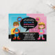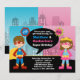 Personalise this pink and blue child's Superhero and Supergirl Birthday Party invitation. Features a cityscape and a boy and girl both dressed up as a superhero.