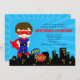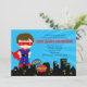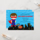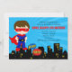 Cute superheroes birthday invitations for boys with super boy and blue sunburst background.