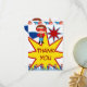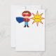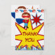 Here are some really cute Superhero Thank You Cards for kids birthday parties, with your child's name on one side and a great big Thank You on the other. This is a flat two sided thank you card with plenty of room for your little super hero to write out his thank you words of gratitude on the backside. These cute Super Hero Invitations have a superhero boy with a blue cape and red eye mask with a "S" on his chest for Superhero. Next to the large superhero character is a star burst design in red and blue. The top border of the invitation has superheroes flying across the invite. The bottom border has superheroes standing on top of buildings along the city's skyline. The invitation text is centred in a big yellow star burst design. The backside of the invitation also has a full colour superhero and another star burst in yellow and red and room to write your thank you. The background of this invitation is white. The font of the invitation text is red and blue in a comic book style font. These are cute and brightly coloured invitations for boys who love Super Heroes or Comic Book characters.