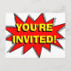 Throw a superhero themed party with these highly customisable super invitations! POW! Keep this sound effect or change it to a more fitting one for your event. The back of the invitation says "YOU'RE INVITED!" with the same comic book style graphic as the front. These invitations would be perfect for a superhero themed party for kids or adults! These postcards are cheaper than regular invitations, so you can plan an exciting and cheap birthday party for your kids with inexpensive invitations!