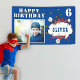 Superhero Comic Speech Cloud Boy Birthday Photo Banner. Fun blue superhero birthday banner for boys with yellow stars and a custom photo. Add your photo, name and age.