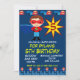 Calling all Superheroes Kids Birthday Party Invitation template for a boys birthday party in blue. These cute Super Hero Invitations have a superhero boy with a blue cape and red eye mask with a "S" on his chest for Superhero. Next to the large superhero character is a star burst design in yellow and red with your child's age. The top border of the invitation has superheroes flying across the invite. The bottom border has superheroes standing on top of buildings along the city's skyline. The backside of the invitation also has a full colour superhero and another star burst in yellow and red, with the age of your child. The background of this invitation is royal blue. The font of the invitation text is white and bright yellow in a comic book style font. These are cute and colourful invitations for boys who love Super Heroes or Comic Book characters. Just enter your child's birthday party information in the template spots. Use the customise it button if you want to move things around or change the colours of the font. These are perfect invitations for a super hero birthday party for boys.