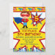 Calling all Superheroes Kids Birthday Party Invitation template for a boys birthday party with a red, blue, and yellow hero colours. These cute Super Hero Invitations have a superhero boy with a blue cape and red eye mask with a "S" on his chest for Superhero. Next to the large superhero character is a star burst design in red and blue with your child's age. The top border of the invitation has superheroes flying across the invite on a background banner of yellow and red. The bottom border has superheroes standing on top of buildings along the city's skyline sketched in blue. The invitation text is centred inside a big yellow star burst design. The backside of the invitation also has a full colour superhero and another star burst in yellow and red, with the age of your child, along with borders of flying heroes. The background of this invitation is white. The font of the invitation text is red and blue in a comic book style font. These are cute and brightly coloured invitations for boys who love Super Heroes or Comic Book characters. Just enter your child's birthday party information in the template spots. Use the customise it button if you want to move things around or change the colours of the font. These are perfect invitations for a super hero birthday party for boys.