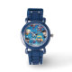 A group of superhero kids and animals in their costumes flying high on blue background.