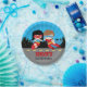 Plates design in superhero boy girl theme with blue sunburst background.