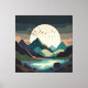 An abstract landscape of a massive supermoon in a mountain lake scene with a flock of birds in bold textures and dark earthy tones of brown, beige, tan, blue, cyan, and black.
