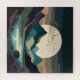 An abstract landscape of a massive supermoon in a mountain lake scene with a flock of birds in bold textures and dark earthy tones of brown, beige, tan, blue, cyan, and black.
