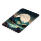 An abstract landscape of a massive supermoon in a mountain lake scene with a flock of birds in bold textures and dark earthy tones of brown, beige, tan, blue, cyan, and black.