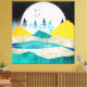 A beautiful landscape with unique textures showing a huge supermoon rising in a mountain landscape with rolling hills and trees in shades of blue, cyan, gold, and yellow.