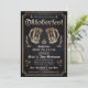 Oktoberfest invitations in a classy, vintage, warm rustic style. Two beer mugs, hops with antique, retro theme. Golden tinge over chalkboard background. Easy to customise!
