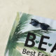 A watercolored sandy beach, ocean waves and palm trees as background, and a blue surfboard on the beach. Personalise and add a name. Quote: Beach. Best Escape Anyone Can Have