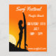 A colourful flyer suitable for a surf festival or beach festival or surf competition featuring a beachy scene of a lady holding a surfboard at sunset on the beach. Fully customisable text.